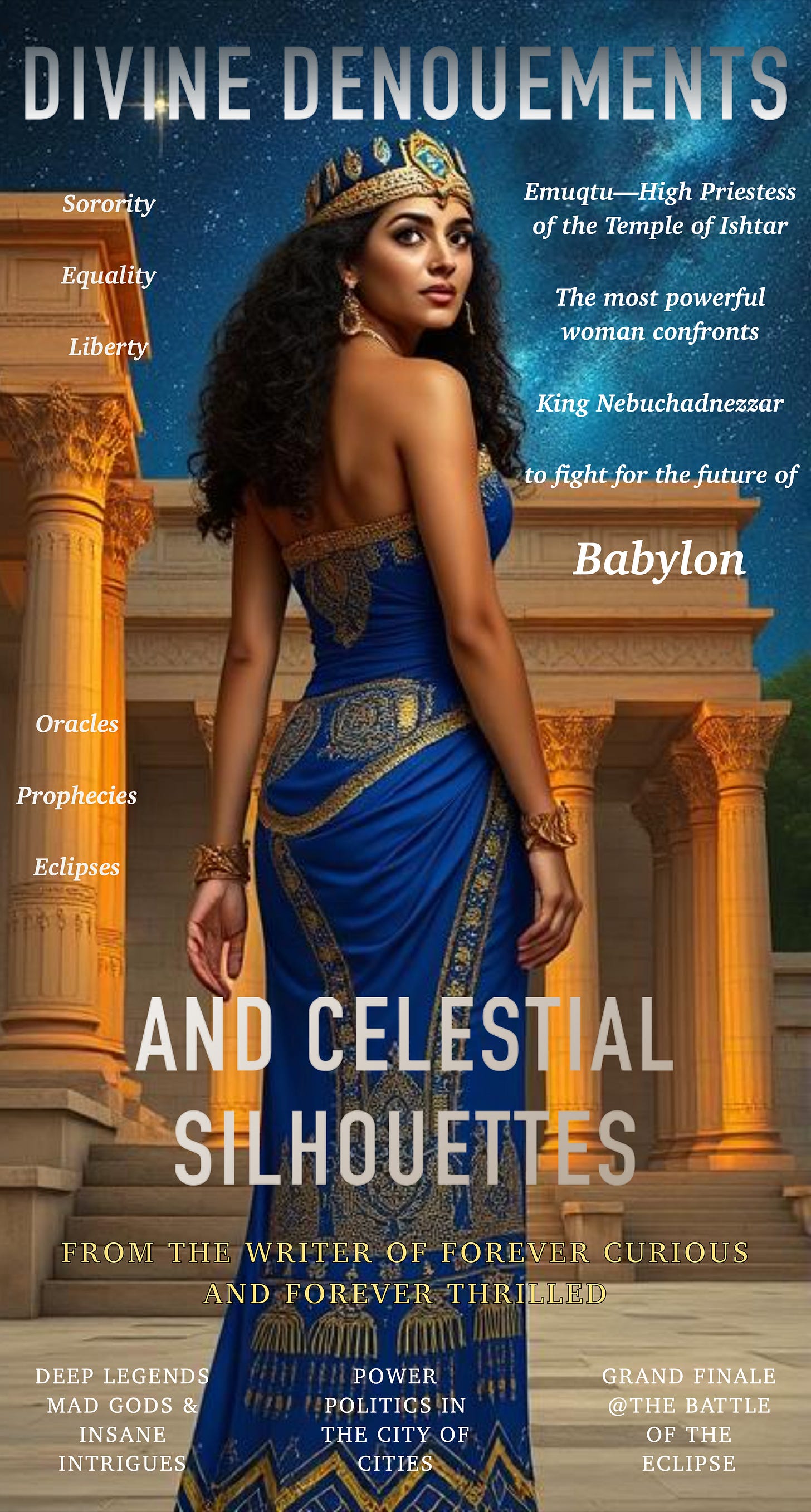 Astronomer Emuqtu becomes High Priestess of the Temple of Ishtar in Babylon after predicting a solar eclipse. With a little help from her friends she transforms Babylon from a dilapidated city into a mesmerising metropolis, seeking Heaven on Earth. Then she arranges peace betweeen warring Media and Lydia, stabilising King Nebuchadnezzar’s reign, in exchange for her final ambition. Will she get it?